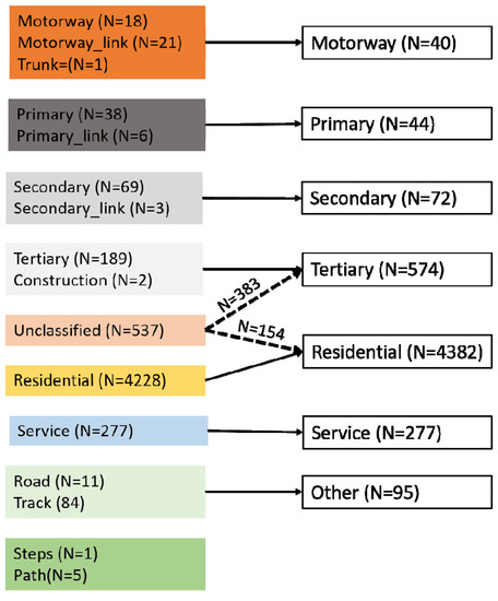 Information about traffic density and road net distribution has been found to be an important variable in many studies [49]. In this study information from Open street map [53] was collected to represent the geographical distribution of the road network. Open street map also contained information about the type of road, and this information was used as a proxy for traffic intensity. The original data from Open street map contained 16 different classes of road. These were aggregated and reclassified into 7 classes including Motorway, Primary, Secondary, Tertiary, Residential, Service and Other roads (Figure 3).