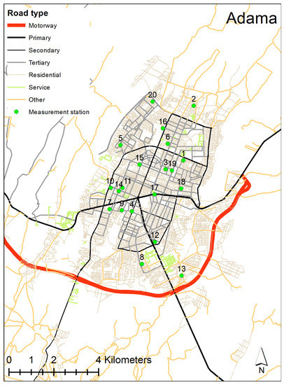 The measurements were performed in the city of Adama, located 99 km south east of the Ethiopian capital, Addis Ababa. The city is commonly described as a commercial, industrial, residential and recreational center for the last couple of decades [40]. Adama is located in the Rift Valley area with an average altitude 1600 m and total area of 200 square kilometers. The weather is mostly dry except during May to October when there is some precipitation [41]. Mean annual rainfall and temperature are 859.9 mm and 21.6 °C, respectively [42]. Urban Adama had a projected 324,000 inhabitants in 2015 (although no census has been conducted since 2007) [43]. The Pan-African highway connecting Djibouti and Addis Ababa previously ran through Adama, now a new multi-lane stretch of the highway, with road tolls, has been built circumventing the city (Figure 1). The city has a large central bus station that serves the Eastern and Southeastern parts of the country.