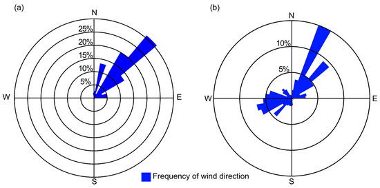 Frequency of wind direction for 2018–2019 during (a) the dry season, and (b) the wet season.