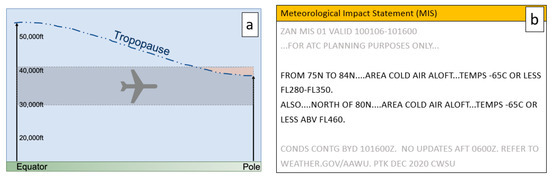 (a) Illustration of how the tropopause height is lower in the poles. (b) Flights are often diverted when widespread Cold Air Aloft (CAA) is present in the upper troposphere and lower stratosphere, which coincides with commercial flight zones in high latitudes. Air temperatures below −65 °C can cause water within the jet fuel to freeze and common fuels begins to form wax crystals, which can reduce fuel efficiency or pose a safety hazard.