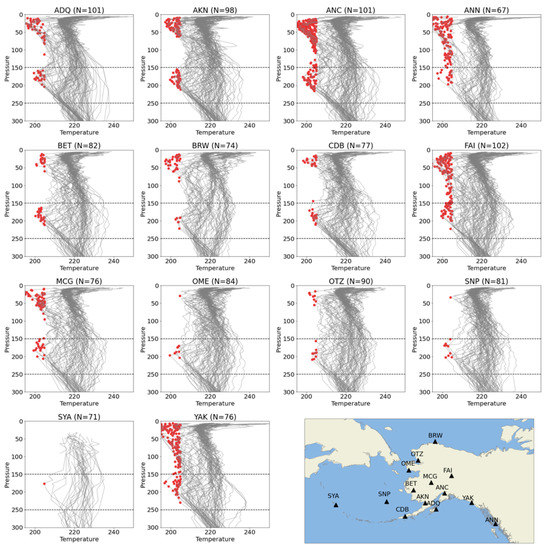 In addition to NUCAPS, conventional radiosondes and Aircraft Meteorological Data Relay (AMDAR) data are often examined alongside NWP models for forecasting CAA [11,12]. Radiosondes vertically sample the atmosphere every 30 m (a pressure layer thickness of less than 10 hPa) up to 30 km in the atmosphere, depending on local weather conditions. While the vertical resolution exceeds most, if not all, other in situ observing systems, radiosondes are only available over land and do not readily span international borders or flight zones. Furthermore, radiosondes are only routinely launched twice daily at 00 UTC and 12 UTC, although special launches occur in cases of severe weather [13]. In Alaska, radiosondes are launched from 14 sites that are shown in the lower right map in Figure 2. The remainder of the plots show temperature profiles from radiosondes (light grey solid lines) from February to March 2018, where red dots indicate temperatures below 208 K (65 °C) and therefore indicate CAA events. The data were obtained from [12]. While radiosondes can accurately detect CAA at a specific point in time and space, they are limited in their ability to characterize the spatial extent of CAA events and their launches may not always take place for reasons such as staffing shortage, equipment malfunction, or network outages. While some sites like Anchorage (ANC) have higher launch counts (N = 101, including both 00 UTC and 12 UTC), radiosondes from remote sites like Shemya Island (SYA) can be affected by frost formation upon passing through stratus clouds which cause balloons to burst at lower altitudes (N = 71) [14].