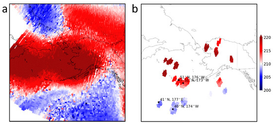 A National Oceanic and Atmospheric Administration Unique Combined Atmospheric Processing System (NUCAPS) horizontal slice along the 200 hPa isobar on 26 February 2018 over the study domain, 40–80° N, 169° E–131° W. (a) Several combined overpasses between 1100 and 1700 UTC and (b) matchups between with Constellation Observing System for Meteorology, Ionosphere, and Climate (COSMIC) profiles within 150 km for the same time period. Blue coloring indicates where the air temperature is below 208 K (−65 °C) to distinguish the presence of a CAA event. Profiles annotated in (b) are shown in Figure 4.