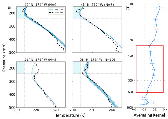 (a) NUCAPS profiles showing the matchups between COSMIC (black dashed line) and NUCAPS (blue solid lines), where the shaded blue box indicates the temperature and pressure criteria for CAA. The profile locations are annotated in Figure 3. (b) The mean (solid line) and standard deviation (error bars) of the averaging kernel matrix (AKM) diagonal vectors are a function of pressure in the study domain on 26 February 2018.
