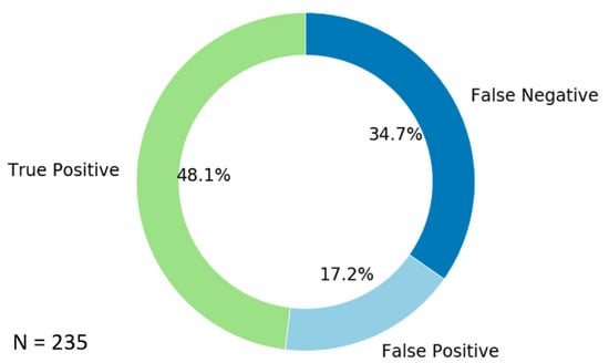 Percentage of matchup profiles between January and March 2018 for the true positive, false positive, and false negative CAA detection states that are summarized in Table 1. Profiles categorized as true negative are the most numerous (N = 1026) but for clarity, are not shown.
