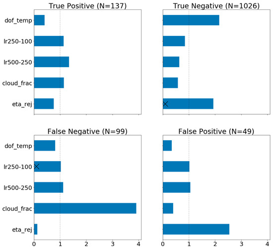 Figure 6 shows the results of the multinomial logistic regression for the true positive, true negative, false positive, and false negative detection states. The true positive (top left, N = 137) state is more likely for profiles with lower values of eta_rej. As described earlier, lower values of eta_rej indicate lower systematic uncertainty due to clouds, which in turn appears to improve NUCAPS’ detection of CAA. Larger lapse rate values (lr250–100 and lr500–200) also increase the odds of the true positive state. This is expected since measurement errors are lower when lapse rates are higher. Finally, low values of dof_temp increase the odds of the true positive state. However, DOF is a full column metric so it is not possible to determine which pressure levels in the column experience a decrease in the vertical resolution. For instance, there could be a decrease in the vertical resolution below 500 hPa, which would not impact CAA detection. So, while the relationship is statistically significant, it is not possible determine why this association is present without examining the full AKM, which is not available in the operational product.