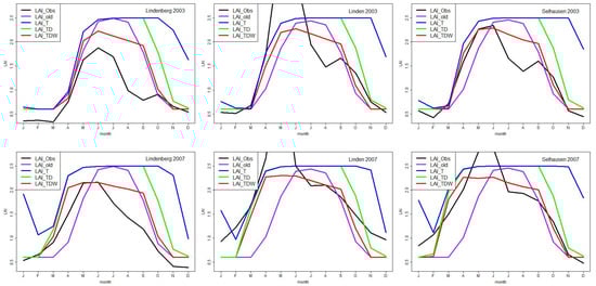 Annual cycle of LAI of the year 2003 with extremely dry summer (top) and the year 2007 with extremely warm spring (bottom) at Lindenberg (left), Linden (middle), and Selhausen (right). In black (–) are the satellite observations (_Obs) and in different colors the simulations with the standard phenology (_old, –), with only the dependence on temperature (_T, –), the dependence on temperature and day length (_TD, –), and with the new phenology (_TDW, –).