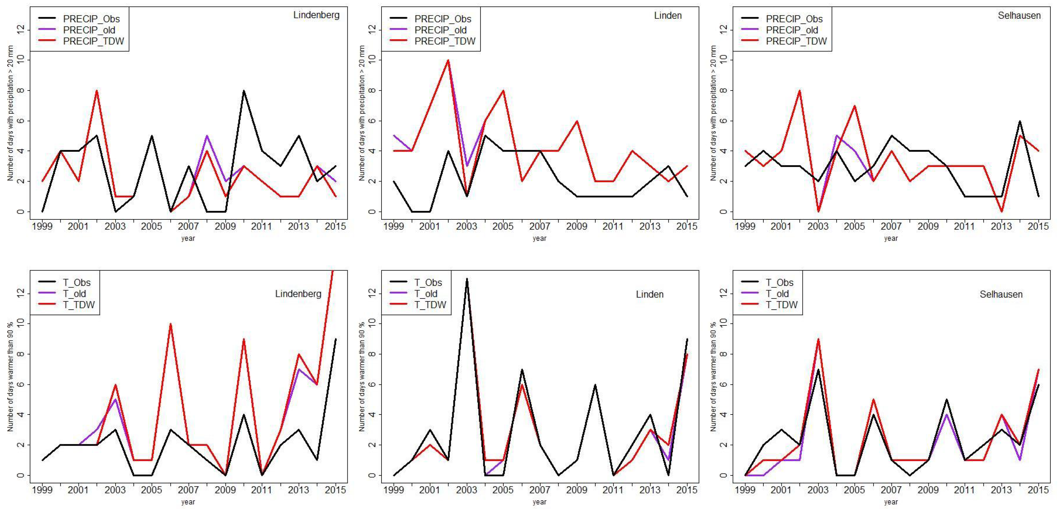 Heavy precipitation events with more than 20 mm per day (top) and very warm days within the 90 th Percentile of the observed maximum temperatures (bottom) in each year of the period 1999 to 2015 at Lindenberg, Linden and Selhausen for the HYRAS observations (_Obs, –), the simulations with the standard phenology (_old, –) and the simulations with the new phenology (_TDW, –).