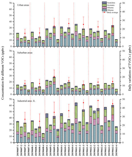 Table 2 presents a summary of the average diurnal variations in VOCs levels in different sampling sites. TVOCs generally displayed higher concentrations in the morning (8:00–9:00; 28.10 ± 10.16 ppbv for urban, 17.40 ± 7.07 ppbv for suburbs, 49.33 ± 11.66 ppbv for JL) and evening (23:00–24:00; 25.93 ± 10.34 ppbv for urban, 17.75 ± 8.12 ppbv for suburbs, 43.85 ± 12.99 ppbv for JL) and lower concentrations at midnight (23:00–24:00; 13.21 ± 5.69 ppbv for urban, 8.26 ± 3.36 ppbv for suburbs, 24.30 ± 6.99 ppbv for JL). Figure 2 illustrates the averaged diurnal patterns of four categories (alkanes, alkenes, aromatics, and acetylenes) of VOCs in urban and suburban sampling sites. Alkanes, alkenes, aromatics, and acetylenes displayed similar diurnal patterns to the TVOCs. The relatively high TVOCs levels in the morning and evening periods could be mainly attributed to the high human activity (i.e., rush hour traffic) [37]. The reasons of the lowest TVOCs concentrations in midnight were dispersion and dilution of the pollutants, which is highly correlated with the consumption of VOCs in the dark reaction processes and extremely low human activities [38]. VOCs were systematically higher in JL because this sampling site is located in an urban area with abundant industries.