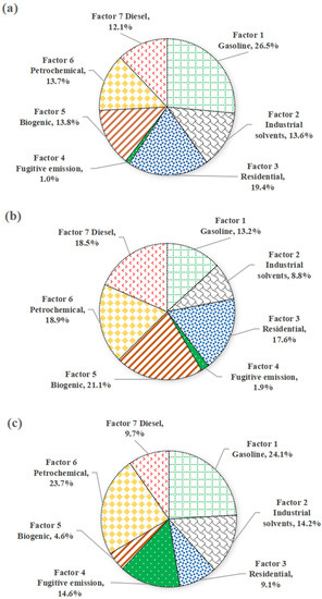 The source contributions toward TVOCs in the urban, suburban, and industrial areas are plotted in Figure 3. Overall, the contributions of each source were similar in the urban and suburban areas but considerably different in the industrial area. Vehicle emission (the sum of gasoline and diesel exhaust, accounting for 38.6% and 31.7% in the urban and suburban areas, respectively) was the main source of ambient VOCs in Luoyang, because of the large amount of vehicle traffic in Luoyang (1.32 million vehicles in 2019). Similar results were reported in other cities in China [16,55]. Moreover, industrial emission (the sum of industrial solvents and petrochemical emission, accounting for 27.3% and 27.7% in urban and suburban, respectively) was the second-highest contributor. The contribution of petrochemicals was higher in the suburbs than in the urban area because of the larger number of petrochemical plants located in suburban areas according to Luoyang’s Statistical Year Book 2018 [56]. The contributions of residential sources were slightly higher in the urban area (19.4%) than in the suburban area (17.6%) because of the high population density and intense human activity in the urban area. Furthermore, the contributions of vegetation cannot be neglected and were higher in suburban (21.1%) than in urban (13.8%) areas, because the suburban sampling sites are mainly located in areas with rich vegetation. A special case can be seen in JL that the contributions of petrochemical and fugitive emissions were as high as 23.7% and 14.6%, respectively. The petrochemical base located in JL is large and produces chemical products of petroleum and crude oil, which explains the higher contribution of petrochemical-related sources (the sum of petrochemical and fugitive emissions, 38.3%) compared with urban and suburban areas. In general, urban and suburban areas should mainly focus on reducing pollution emissions from traffic sources, and JL needs to formulate strict emission control policies and improve the process management for the local petrochemical industry.