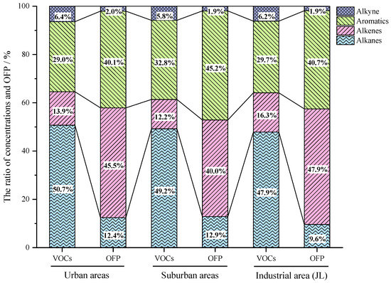 The average concentrations and OFP proportions of the four categories (alkanes, alkenes, aromatics, and acetylene) and the OFP values in urban, suburban, and industrial sites are reported in Figure 4 and Table S8, respectively. The OFP generally followed the sequence of alkenes (aromatics) > alkanes > alkynes, and the OFP in the industrial area was almost 2–3 times higher than in urban and suburban areas. Moreover, high OFP values were observed in JX and YX, which was closely related to their relatively high VOCs emissions. Although alkenes accounted for only 12.2–16.3% of the TVOCs, they were the relatively large contributors to OFP (40.0–47.9%), mainly because of their high reactivity [57]. Aromatics also contributed up to 40.1–45.2% of the total OFP with 29.0–32.8% mass contribution to the TVOCs, because of the high concentration of aromatics and high reactivity. Alkanes displayed the highest TVOCs occupation (49.8%) but the lowest OFP proportion (12.3%), suggesting a limited role in photochemical reactions and O3 formation. Therefore, alkenes and aromatics should be preferentially considered in regional O3 control strategy development.