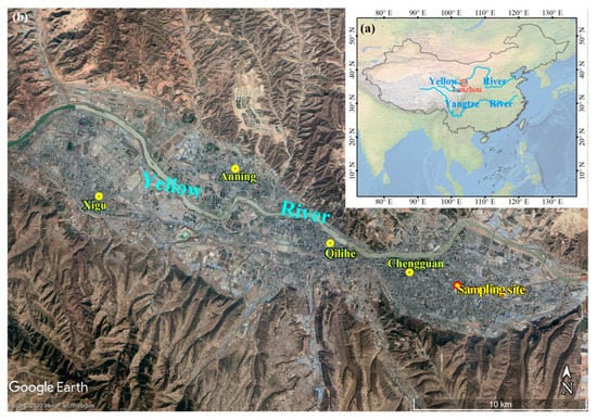 (a) Geographical location of Lanzhou, China and (b) locations of the sampling site on the topographic map. Background map was retrieved from Google Earth.