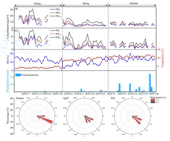 Time series of the EC and OC concentrations in PM1, PM2.5, and PM10, respectively. The temperature, relative humidity (RH), precipitation, and wind speed (WS) and direction (WD) were recorded by the automatic weather station.