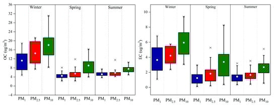 Seasonal variations of OC and EC in the PMs, where each box indicates the 99%, 75%, 50%, 25%, and 1% quartiles of the data from the top to the bottom.