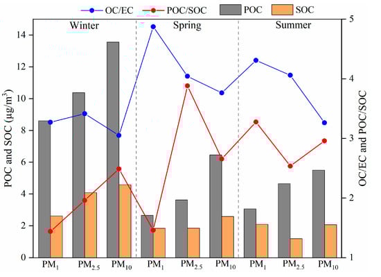 Seasonal variation of POC, SOC, OC/EC, and POC/SOC in different-sized PMs.