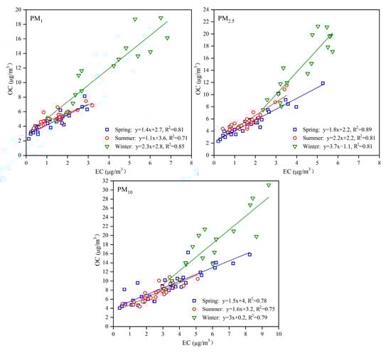 To explore the origin of carbonaceous aerosols in Lanzhou, the relationship between OC and EC was investigated. Figure 5 shows the OC and EC concentrations in PM1, PM2.5, and PM10 during three seasons in Lanzhou. OC and EC exhibited a significant linear correlation (R2 > 0.71, p < 0.01) during the whole sampling time, indicating their strong coemission, especially in PM2.5 (R2 > 0.81), which suggested their close emission sources. The highest correlation coefficient was found for PM2.5 samples in spring (R2 = 0.89), indicating that the sources of OC and EC were closer in spring than for the other seasons. Compared with the other seasons, the intercept in winter was much higher, which may be due to the rich SOC.