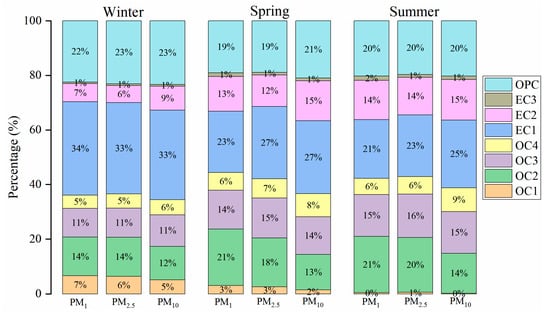 As shown in Figure 6, EC1, OC2, and OPC were the main components of carbon and represented pollution sources from coal, motor vehicle exhaust emissions, and biomass combustion. EC1 contributed 25.3% to TC in spring, 23% in summer, and 33.5% in winter, which indicated that coal combustion was the main emission in winter. OC2 accounted for 17.1% of TC in spring, 18.3% in summer, and 13.5% in winter. OPC constituted 19.6% of TC in spring, 20% in summer, and 22.9% in winter.
