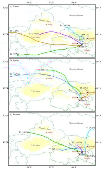 Figure 7a shows that air masses are largely contributed by those from the Inner Mongolia Plateau (T1, 58.1%) passing through Baiyin City in winter, which is more susceptible to long-distance transmission from the Inner Mongolia Plateau due to the Mongolia–Siberian high pressure in winter [49]. Under the influence of pervasive continental cold air masses, the wind blows from the Mongolian Plateau to Lanzhou, the cold air moves southward, and the wind and sand dominate over Lanzhou. Figure 7b shows that there were three possible pathways (T1–T3) for air masses to arrive at the sampling site from their distant sources in spring. The T1 trajectory originated from Central Asia, accounting for 36.7% of the total air mass. This path carried a large amount of sand and dust to the sampling site. The T2 trajectory originated from the Zhungeer Basin in northern Xinjiang and reached the sampling site through the Altai Mountains and the western Inner Mongolia Plateau, accounting for 33.3% of the total air mass. The T3 trajectory originated from the Mongolian Plateau, passing through the Ningxia and accounting for 30% of air masses in spring. In summer, air masses were largely contributed by those from the southeast of Lanzhou (T3, 45.2%), followed by those from the Hexi Corridor passing through the Wuwei City (T5, 19.4%) (Figure 7c). In conclusion, air masses from the Inner Mongolia Plateau, southeast of Lanzhou, Xinjiang, Ningxia, and Hexi Corridor may affect the concentration of pollutants in Lanzhou.