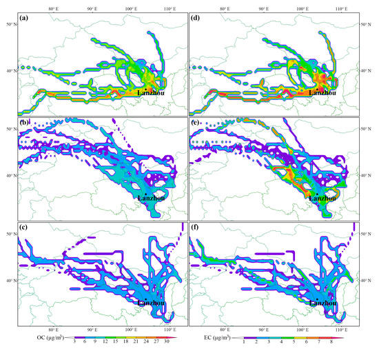 Concentration-weighted trajectory (CWT) of OC in (a) winter, (b) spring, and (c) summer and of EC in (d) winter, (e) spring, and (f) summer in PM10 in Lanzhou.