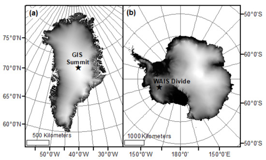 Location of firn core collection and automated weather station sites: (a) Summit, Greenland (GIS Summit) and (b) West Antarctic Ice Sheet (WAIS) Divide, Antarctica (WAIS Divide). Coring locations are plotted on the Greenland 5 km digital elevation model (DEM) [18] and the Antarctic 1 km DEM [19]. Greenland and Antarctica are displayed using the WGS 1984 Arctic and Antarctic Polar Stereographic Coordinate systems, respectively. The Summit firn core was collected from ~3200 m above sea level and the elevation at WAIS Divide was ~1800 m.