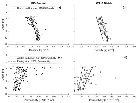 Firn density profiles (a,b) and permeability profiles (c,d) between 3.5 m and 11 m depth at GIS Summit (a,c) and WAIS Divide (b,d). The solid black line in panels (a,b) is the modeled firn density profile generated from Herron and Langway (1980) [12]. In panels (c,d), the solid black line represents the modeled permeability profile from Adolph and Albert (2014) [14] and the dashed black line shows modeled permeability profiles using the model of Freitag et al. (2002) [15]. All modeled density and permeability profiles shown were generated using an accumulation rate of 0.22 m yr−1, mean air temperature of −28 °C, and surface snow density of 0.34 kg m−3.