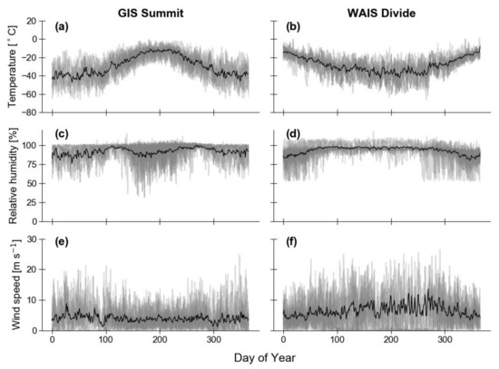 Meteorological data from both Summit (panels (a,c,e)) and WAIS Divide (panels (b,d,f). Air temperatures at the two sites are shown in panels (a,b), relative humidity values are displayed in panels (c,d), and wind speeds are plotted in panels (e,f). Hourly data are plotted from the years 1997–2007 for Summit and 2009–2019 for WAIS Divide vs. the day of the collection year with grey transparent lines, so that progressively darker greys show overlapping data. Black lines show a mean meteorological value for the given day of the year, averaged over the collection period.