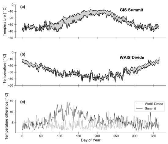 Variability of daily air temperatures at Summit (a) and WAIS Divide (b). Averaged daily minimum and maximum temperatures are plotted, with the shaded area representing the daily temperature variability. The difference between the highest and lowest daily temperatures are plotted in panel (c).