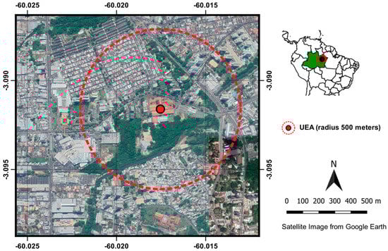 UAV flights were performed on the campus of the School of Technology at the Amazonas State University (3.0918° S, 60.0175° W). The campus is centrally located in Manaus. The campus is surrounded by a forested region that transitions into urbanized residential and commercial areas surrounding the campus (Figure 1). Manaus is the largest and most populous city in Amazonas state in Brazil. It has more than 2 million residents, and its urbanized land area is more than 200 km2.
