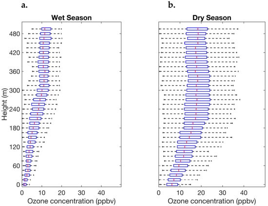 Observations of nighttime ozone concentration recorded by the UAV flights at different altitudes at the urban UEA campus in central Amazon are presented in Figure 2 for the wet and dry seasons. The vertical profiles are individually plotted in Figure S1 for each night. The data for the wet season were from Guimarães et al. [] (Figure 2a), and the statistics of those observations were re-plotted in this study for comparison between the two seasons. The work of Guimarães et al. [] was conducted at the same location and times of night as the present study. The data of the dry season of this study are plotted in Figure 2b.