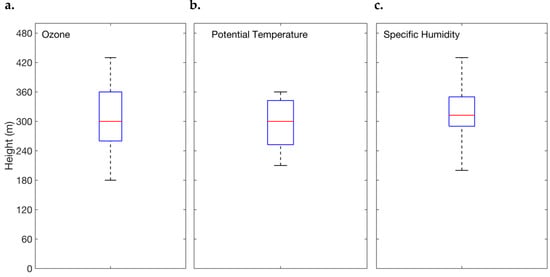 Box-whisker statistics plots of the height of the nighttime boundary layer during the dry season of 2018 based on (a) ozone concentration, (b) potential temperature, and (c) specific humidity (84 flights). The median (red line), quartiles (blue box edges), and the minimum and maximum values (black lines) are represented, excluding outliers. Flights took place between 20:00 and 00:00 (LT). Local time (LT) was 4 h earlier than UTC.