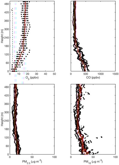 The CO, PM2.5, and PM10 pollution sensors on the UAV provided an additional perspective on the structure of the nighttime boundary layer. Figure 4 plots examples of eight vertical profiles collected on the night of 29 September 2018. The profiles extended from land surface to an altitude of 500 m. The red line represents the median of the data at each altitude. The vertical profile of ozone concentration is well explained by entrainment of ozone-laden air above the NBL height and its dry deposition to the land surface, as described above. By comparison, the vertical profile of carbon monoxide has a different behavior. A typical background concentration for Amazonia is 80–120 ppbv []. The observed surface concentration on 29 September 2018 was 500 ppbv. The explanation for higher concentrations is CO emission from the urban vehicular fleet [,]. The concentration decreases to the regional background concentration of 100 ppbv by 200 m. The profiles of O3 and CO concentrations are thus the inverse of one another. Ozone has an overhead regional source and a surface sink, and carbon monoxide has a localized urban surface source that dilutes to the regional background concentration at altitude. The profiles are symmetric by a mirror plane, and both profiles separately indicated an NBL height on this night of 160–200 m, which was lower than typical during the study period (see above). A step profile in concentration is characteristic of quiescent nights []. By comparison, the gently sloped profiles of O3 and CO concentration in Figure 4 indicated a night of moderate downward injection and turbulence. In this regard, the two independent profiles provided a consistent conclusion. The vertical profiles of PM2.5 and PM10 plotted in Figure 4 indicated an absence of significant local pollution on this night. The consumer vehicular fleet active during nighttime congestion in Manaus is modern, and the direct emissions of PM2.5 and PM10 from this fleet are small (the daytime fleet includes heavy vehicles that emit soot from diesel engines).