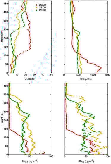In this paper, results from flights in the dry season are presented, and differences between the two seasons were analyzed. Moreover, compared with Guimarães et al. [] for which ozone concentration, temperature, and relative humidity were collected, a broader range of species concentrations was collected in this study. Profiles of carbon monoxide and particulate matter (PM2.5 and PM10) were simultaneously collected. These species are markers of urban pollution and biomass burning, both of which can have continuous nighttime surface sources. By comparison, ozone derives from an overhead reservoir that undergoes dry deposition at the surface throughout the night. Thus, process-wise, the two sets of species strongly complement one another.