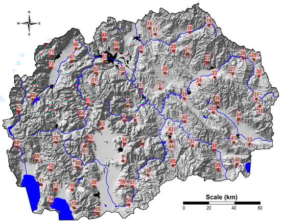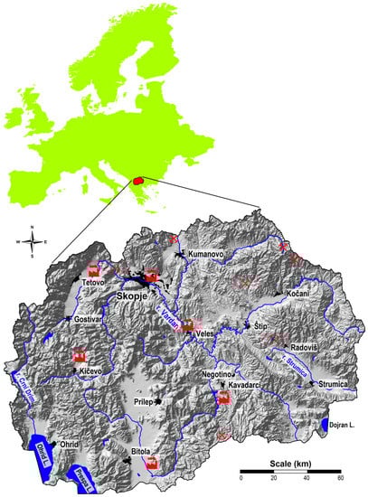 The Republic of Macedonia is a landlocked country situated in the central part of the Balkan Peninsula. Macedonia is bordering Serbia and Kosovo to the north, Bulgaria to the east, Albania to the west, and Greece to the south (Figure 1). A detailed description of the country (location, climate, and demographics) can be found elsewhere [17,18,19,20,21,22,23,29,30]. The location of main industrial activities and their input of different PTEs, has been also previously reported in several studies [31,32,33,34,35,36,37,38,39,40,41,42,43,44,45,46].