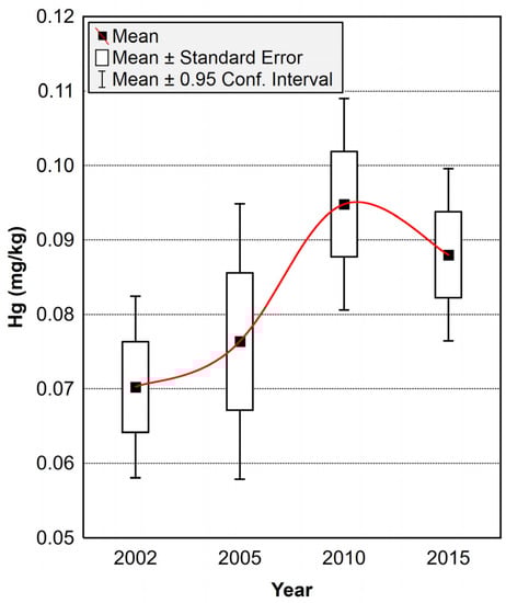 The mean value of mercury content in the moss samples increased in the period 2002–2010, while the value decreased for the samples collected in 2015 (Table 2, Figure 3). The coefficients of variation (CV%) are very high, with high values of asymmetry and distribution with a large range of variation of the positively skewed concentration data indicating the influence of different natural and anthropogenic factors. In addition, an analysis of variance (ANOVA) was performed which showed significant differences between the four sampling seasons (F = 5.43/p = 0.0012), which means that moss biomonitoring every 5 years is appropriate.