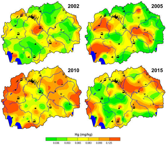 Distribution maps based on the content of Hg in moss samples collected in 2002, 2005, 2010 and 2015 (Figure 4) show some differences and a discrepancy, i.e., variation with time as well as geographically, but it can be noticed that an increased Hg content is visible in the same regions for the whole period of the research. In 2002, the higher Hg content in the moss samples can be seen along the valley of the river Vardar, which extends from the cities of Skopje to Veles and continues southeast toward the border with Greece. It should be also mentioned that in 2002 pollution with Hg is connected with the activities of the lead and zinc smelter plant in the town of Veles [25] which had operated until 2003, as well with the work of the steelwork in Skopje [17,45]. Higher content of Hg in the mosses collected in 2002 sampling campaign was observed on the north–eastern part of the country (in the vicinity of the town of Kočani) where three Pb–Zn mines and flotation plants (Sasa, Toranica, Zletovo) are located [39].