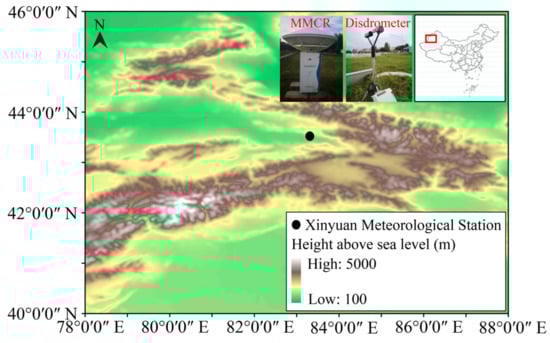 To further understand the characteristics of clouds and precipitation in arid areas, the Institute of Desert Meteorology, China Meteorological Administration, Urumqi, conducted cloud and precipitation observation experiments in Xinjiang Province, China, from 1 March to 31 May 2020. The experiments were carried out at the Xinyuan Meteorological Station (XY, 83.25° E, 43.45° N, 929.7 m above sea level) located inside the trumpet-shaped terrain formed by the Tianshan Mountains in Xinjiang Province. Instruments included an MMCR and disdrometer. The observation location and instrument are shown in Figure 1.