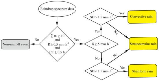 In the process of determining the characteristics of the diurnal variation, for each minute of data when the total number of raindrops output by the instrument is ≥10 and the R ≥ 0.1 mm · h−1, it is regarded as one precipitation minute, and the rest are regarded as non-precipitation data. In the process of the classification of precipitation types, the constraint conditions are more stringent, as shown in Figure 2. Two conditions must be simultaneously met for precipitation minutes [66]: (1) the R ≥ 0.5 mm · h−1, and (2) the rainfall continuous-time CT ≥ 0.5 h. On this basis, for a certain time ti, from ti - Ns to ti + Ns, R ≥ 5 mm · h−1 and standard deviation SD > 1.5 mm · h−1 are the convective rain event; R < 5 mm · h−1 and SD < 1.5 mm · h−1 are the stratiform rain event; otherwise considered as stratocumulus rain event [30,67]. In this study, the Ns is set to be five.