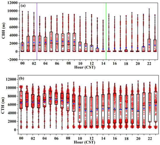 The MMCR outputs are CBH, CTH, CTK, CLN. To show the characteristics of a diurnal variation, the data are processed according to an hourly distribution. At a certain cloud layer in a certain minute, CBH of 15,030 m, CTH of 20,040 m, and CTK of 5010 m are considered to be invalid data, and the invalid data at this minute were deleted. Accordingly, CLN is reduced by 1 min.