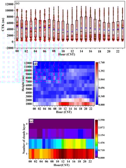 Diurnal variations in (a) the cloud base height (CBH) (m), (b) the cloud top height (CTH) (m), (c) the cloud thickness (CTK) (m), (d) the frequency distribution of the CTK, and (e) the frequency distribution of the cloud layer number (CLN) during the observation period. On each box, the blue square represents the average, the central crossbar indicates the median, and the bottom and top edges of the box indicate the 25th and 75th percentiles, respectively. The black whiskers extend to the maximum and minimum of the data points, respectively. The positions of the purple and green vertical lines are midday and midnight in Figure 3a, respectively.