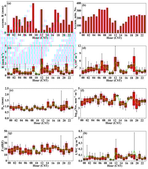 Diurnal variations in (a) accumulated rain amount, (b) accumulated rainy minute number, (c) precipitation intensity (R) (mm · h−1), (d) number concentration of total raindrops (Nt) (m−3), (e) mass-weighted mean diameter (Dm) (mm), (f) normalized intercept parameter (Nw) (mm−1 · m−3), (g) radar reflectivity (Z) (dBZ), and (h) liquid water content (LWC) (g · m−3) during the observation period. The green line represents the average, on each box, the central crossbar indicates the median, and the bottom and top edges of the box indicate the 25th and 75th percentiles, respectively. The black whiskers extend to the maximum and minimum of the data points, respectively.