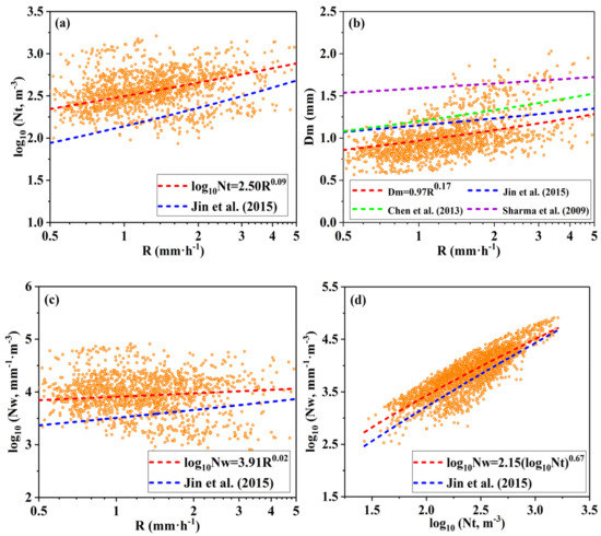 In this subsection, empirical relationships of rainfall physical quantities for stratiform precipitation are proposed. The value of Nt usually increases with the increase in the R. Their relationship was given by Ulbrich et al. [28] as . Jin et al. [69] provided the relationship for stratiform rainfall in the area between the Yangtze River and Huaihe River in eastern China as . Figure 6a shows the scatterplots of and R and the curve fitted by the least square method for the Xinjiang data. The fitting equation is and has a larger coefficient and a smaller exponent than Jin et al. [69], and the correlation coefficient of the relationship is 0.65. Compared to the humid eastern region of China, the arid Xinjiang region needs a greater Nt to produce the same R. Similarly, when Nt is the same, the R in Xinjiang is smaller than in eastern China.
