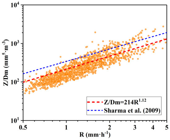 In this subsection, the relationship is established for stratiform rainfall in Xinjiang. Testud et al. [59] highlighted that an empirical relationship involving a single measurement parameter Z may not provide desired rain retrieval accuracy. Sharma et al. [41] considered another parameter Dm, using and R to establish a new empirical relationship for stratiform rainfall, and significant improvement is observed in rain retrieval by using the relationship relative to the conventional relation. In this study, we used the scatterplots of and R to establish a fitting curve as (Figure 8), which has a smaller coefficient and a larger exponent than the relation given by Testud et al. [59]. More importantly, the correlation coefficient of of 0.88 is larger than that of of 0.78 (Table 2). Simultaneously, the root mean square error is reduced from 0.99 mm · h−1 of R measured by the disdrometer and R derived from the relationship to 0.92 mm · h−1 of R measured by the disdrometer and R derived from the relationship. There is an improvement in rain retrieval by using the relation compared to the conventional relation. Table 2 shows the CCs of all empirical relationships established in this study for stratiform rainfall in Xinjiang. Notably, the order of the correlation coefficient is > > > > > .