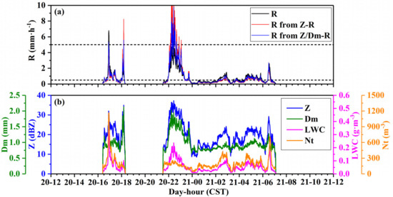 (a) Temporal variation of estimated rain intensity (mm · h−1) by using , relations and measured by the disdrometer and (b) Z (dBZ), Dm (mm), LWC (g · m−3), and Nt (m−3) on 20–21 May 2020.