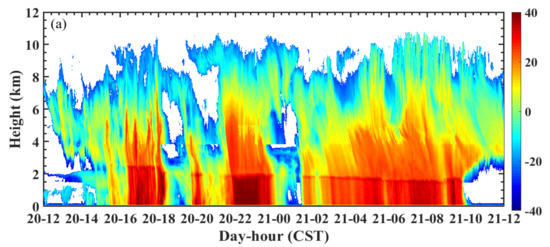 The MMCR used in this study was a Ka-band radar of 8 mm wavelength produced by the No. 23 Research Institute of China Aerospace Science and Industry Corporation. The Ka-band MMCR adopts an all coherent, all solid-state, pulse compression, pulse Doppler, single-shot, single polarization radar, which can obtain cloud base height (CBH), cloud top height (CTH), cloud thickness (CTK), cloud layer number (CLN), other cloud macroscopic properties, radar reflectivity, mean Doppler velocity, spectrum width, and other microphysical characteristics. The Ka-band MMCR has a temporal resolution and spatial resolution of 1 min and 30 m, respectively, and the detection height ranges from 0.06 to 20 km. In addition to the attenuation of electromagnetic waves passing through clouds, radar noise level calculation, cloud-precipitation signal extraction, signal attenuation correction, non-meteorological echo removal, retrieval of the cloud-precipitation macrophysical quantity and other processing may also cause some uncertainty in the data [20,21].