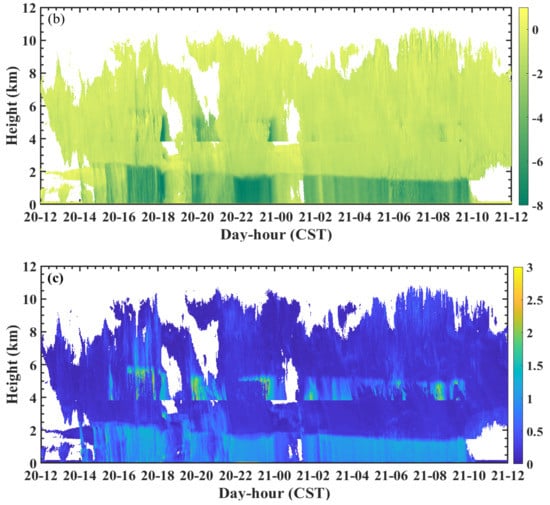 Time–height profile of the (a) radar reflectivity factor (dBZ), (b) Doppler velocity (m · s−1), and (c) velocity spectrum width (m · s−1).