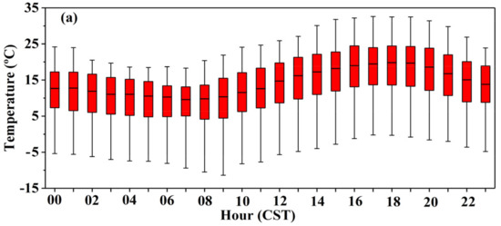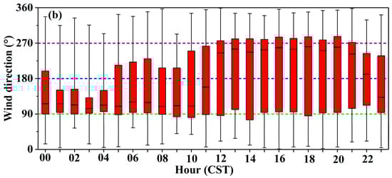 Diurnal variations in (a) temperature at 2 m (°C), and (b) wind direction at 10 m (°) during the observation period at Xinyuan Meteorological Station. On each box, the central crossbar indicates the median, and the bottom and top edges of the box indicate the 25th and 75th percentiles, respectively. The black whiskers extend to the maximum and minimum of the data points, respectively. The green dashed, blue dashed and purple dashed lines are the positions of east wind, south wind and west wind, respectively.