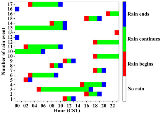 Figure 4 shows the diurnal variations of accumulated rain amount, accumulated rainy minute number, R, Nt, Dm, Nw, Z, and LWC over a 24 h period. Figure 4a,b shows that there are three apparent precipitation periods, which are from 02:00 to 09:00, 12:00 and from 17:00 to 21:00 CST. The three periods produced maximum precipitation amounts accounting for 79.18% of the total rainfall and a higher rainy minute number accounting for 68.48% of the total. The average R and LWC (Figure 4c,h) also showed that there were larger Rs and LWCs than at other times during the three periods. For the three periods, the average values of R and LWC varied from 0.41 to 2.13 mm · h−1, from 0.04 to 0.09 g · m−3; 1.88 mm · h−1, and 0.15 g · m−3; from 0.53 to 1.41 mm · h−1, from 0.04 to 0.17 g · m−3, respectively. The average Nt and Nw (Figure 4d,f) show the same diurnal variation. Specifically, the average Nt and Nw of the three periods from 02:00 to 09:00 CST, from 12:00 to 13:00 CST, and from 17:00 to 19:00 CST are larger than those at other times. In these three periods, the average values of Nt and Nw were in the ranges of 2.13 × 102–5.29 × 102 m−3, 4.57 × 102–1.45 × 103 mm−1 · m−3; 4.61 × 102–5.31 × 102 m−3, and 1.15 × 103–1.86 × 103 mm−1 · m−3; 3.76 × 102–5.01 × 102 m−3, 9.33 × 102–1.18 × 103 mm−1 · m−3, respectively. The average of Dm (Figure 4e) from 14:00 to 21:00 CST and the average of Z (Figure 4g) from 12:00 to 21:00 CST are generally larger than other time periods. For the two periods, the range of the average values of Dm and Z are 0.87–1.28 mm and 16.26–23.84 dBZ, respectively. Upon comparing the averages and medians of R, Nt, Dm, and LWC, we found that most of the averages were higher than the medians, implying that the majority of precipitation events had lower values for these quantities than the averages. In addition, the changes in the medians and the averages of these quantities over time are more drastic and evident from 12:00 to 21:00 CST (which is daytime in local time) than other times; correspondingly, Figure 3 shows a lower CBH, lower CTH, and a higher CLN during this period.