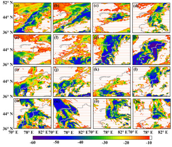 The TBB (black-body temperature) from FY-2G (Fengyun 2-G satellite) at the beginning of each rainfall event, rainfall event 1 to rainfall event 17 are (a–p), respectively (except rainfall event 16, because rainfall event 16 and rainfall event 15 are affected by the same system).