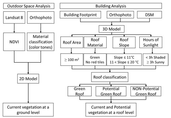 The vegetation analysis was conducted using two methodologies: a 2D model developed for green urban areas at a ground level and a 3D model for a green roof analysis. The flowchart in Figure 1 describes the methodology and the input data used to identify the green surfaces at a ground level with the 2D model, and the existing and possible future green roofs with the 3D model, together with the identification of some criteria, such as: the typical green color, a minimal dimension, the slope, and the shading percentage.