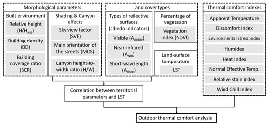 The outdoor thermal comfort analysis was performed considering the morphological parameters, the land cover types (at a building block scale) and the thermal comfort indexes calculated with the WS data (Figure 2).