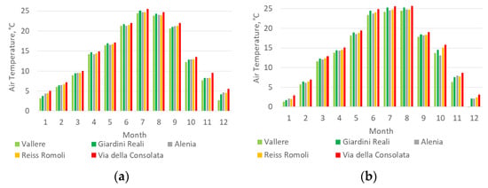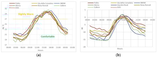 Another factor that influences the comfort of urban spaces is evapotranspiration. The cooling effect of green areas, due to the combined effect of shade and evapotranspiration, can significantly reduce the outdoor air temperature [30,31]. The evapotranspirative effect of trees is manifest during summer, but it becomes less evident in winter due to a reduction of the greenery [30]. From the results of Robitu et al. [29], it has emerged that the presence of trees reduces the SVF and the radiation absorbed by the human body. Vegetation and water should be considered as a key for the improvement of microclimate conditions. In general, the main heat mitigation strategy is the use of vegetation in different forms. Vegetation reduces heat thanks to evapotranspiration, reflecting the sun and the blocking the solar radiation [17].
